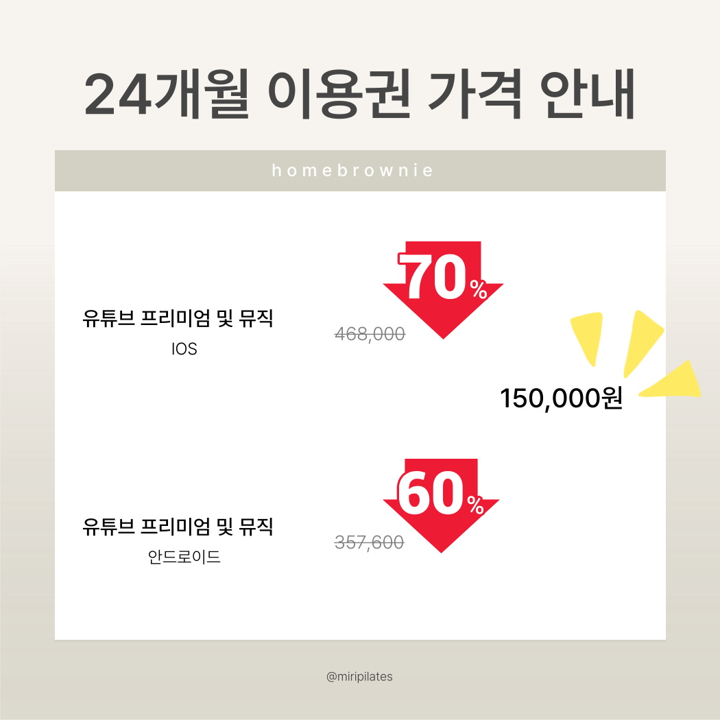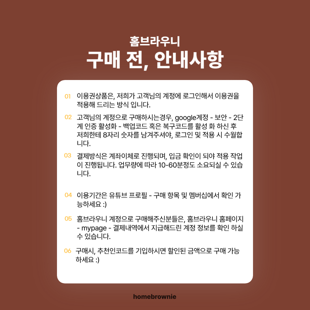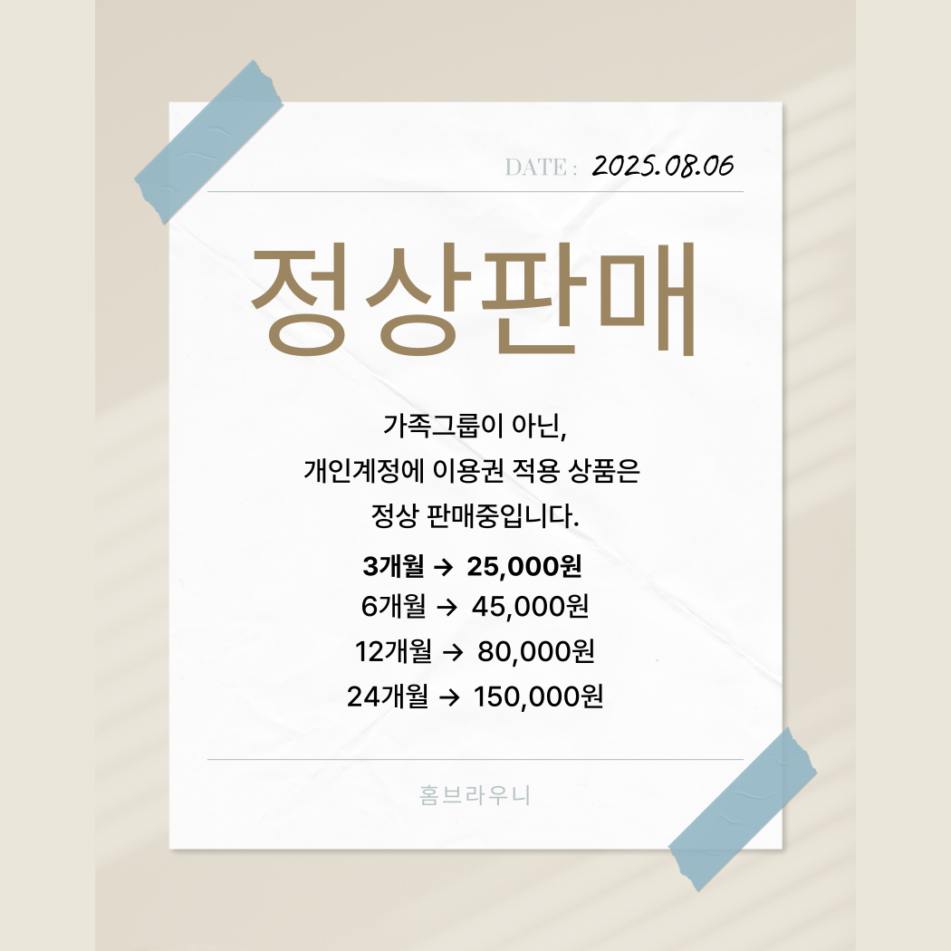 홈브라우니에서 제공하는 유튜브 프리미엄 및 유튜브 뮤직 서비스는 Google의 '가족 그룹' 기능을 기반으로 제공됩니다. Google 정책에 따라 12개월 내 가족 그룹 탈퇴/재가입은 1회만 가능합니다.